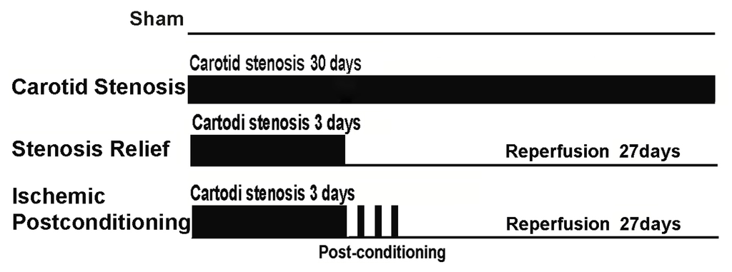 Schematic depicting the order of surgical procedures for Wistar rats undergoing sham operation, carotid stenosis, stenosis relief and ischemic postconditioning (ischemic postconditioning consisted of 3 cycles of 30-s/30-s reperfusion/clamping after 15 min ischemic episode).