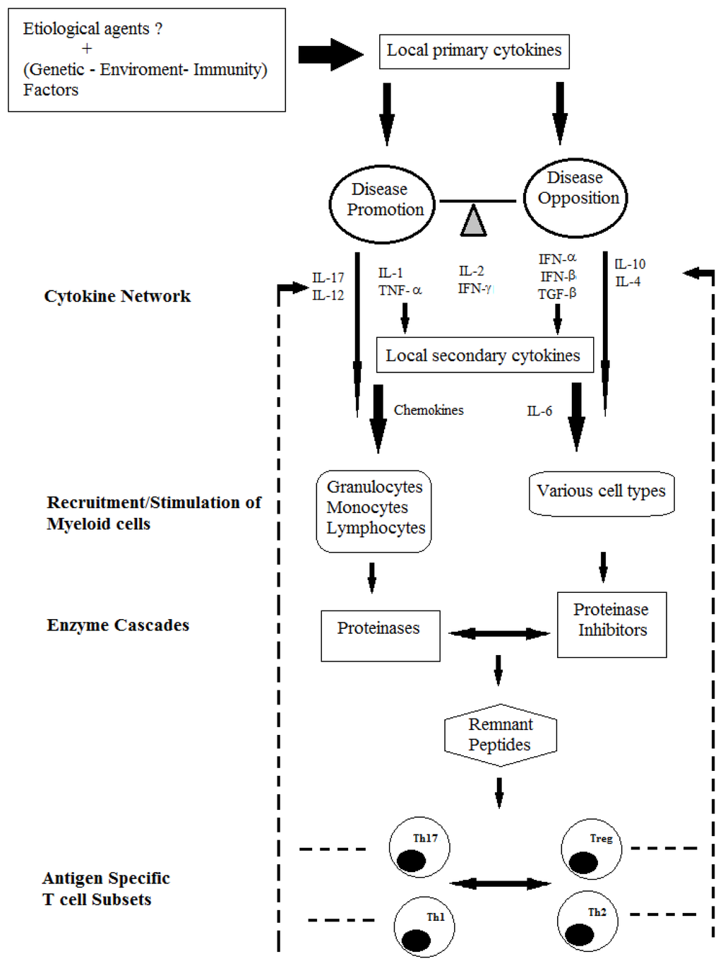 The model used MMP-2 and MMP-9 as examples of proteinases, because previous publications linked MMP-9 in the cerebrospinal fluid with multiple sclerosis and other neuroinflammatory diseases and because myelin basic protein (MBP) was cleaved into immune-dominant peptides by MMP-9 [15,16]. Although most recognized for these two aspects, the REGA model contained much more information related to autoimmune diseases (e.g., about regulatory cytokines) that was instrumental and will remain important for the future drug development [14]: (a) it addressed the critical point that (unspecific) inflammatory reactions with myeloid cells may be primordial and a possible target in MS. In 1994, this was rather controversial and led to some opposition in an era when most MS research was centered on T cells. (b) It translated the central stage of inflammation in the autoimmune process into molecules and addressed the importance of balances between pro-inflammatory versus anti-inflammatory primary cytokines in the disease process. Interleukin-1β (IL-1β), TNFα (Tumor Necrosis Factor-α) and IFN-γ (Interferon-γ) were included as pro-inflammatory cytokines and IFN-α/β and TGF-β (Transforming growth factor β) as anti-inflammatory cytokines. (c) It addressed the role of myeloid antigen presenting cells in the activation of T cells. Moreover, MBP-specific T cells isolated from MS patients and encephalitogenic T cells recovered from immunized animals have confirmed that T cells play a central role in the MS pathology [17–19].