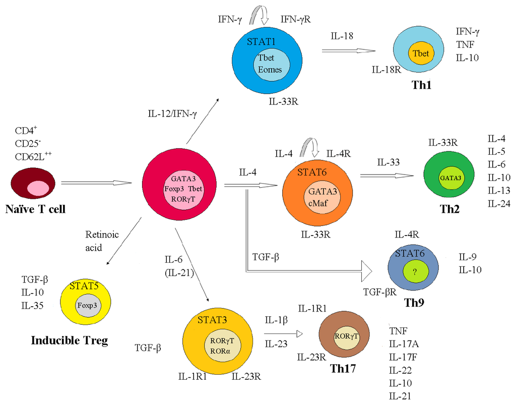 T helper cell differentiation. When naïve CD4+ T cells, classified by absence of CD25 and high levels of CD62L, encounter specific antigens, they can differentiate into different effector subsets. It is likely that several “master” transcription factors, individually required for T-cell differentiation towards one of the end effector stages, are initially expressed upon engagement of the TCR with costimulatory receptors. Each transcription factor drives a specific set of genes required for lineage commitment and the expression of signature cytokines and negatively affects alternative pathways. However, the microenvironment is the driving force that determines the outcome of the differentiation course. Th1 cells are established in the presence of IFN-γ and IL-12 and signaling via STAT1 and STAT4, resulting in the expression of the master transcription factor T bet. Th2 cells depend on IL-4 and STAT6 for the increased expression of GATA3, whereas the simultaneous presence of TGF-β results in the development of Th9 cells, utilizing an undefined master transcription factor. The presence of TGF-β, with IL-2 signaling via STAT5, is known to generate, at least in vitro, inducible Treg, which utilize Foxp3. Also, it is TGF-β in combination with IL-6 signaling via STAT3 that drives the expression of RORγt, resulting in the differentiation of Th17 cells.