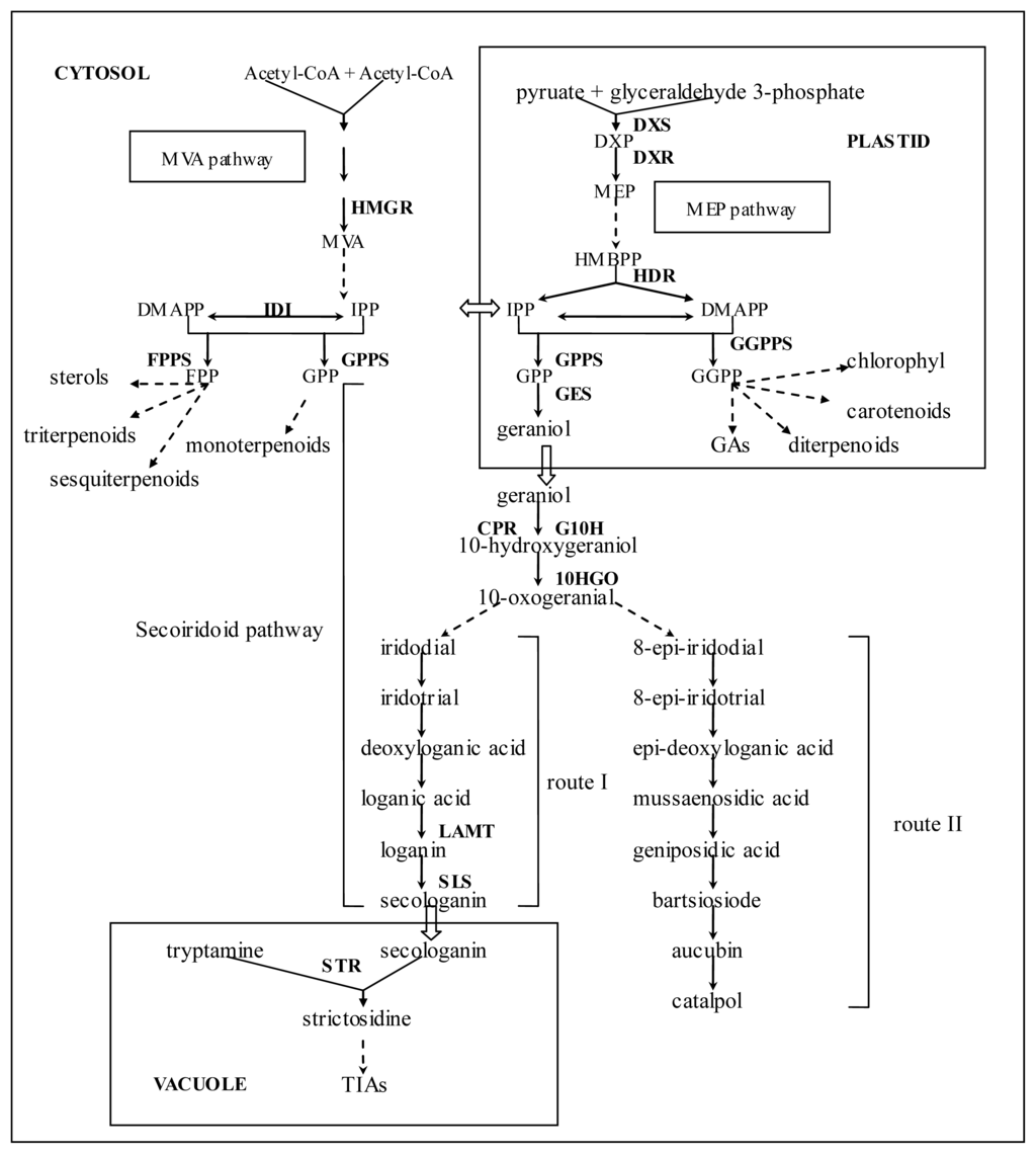 Overview of iridoid biosynthesis in plants. CPR: cytochrome P450 reductase; dmapp: dimethylally diphosphate; DXP: 1-deoxy-d-xylulose 5-phosphate; DXS: 1-deoxy-d-xylulose-5-phosphate synthase; DXR: 1-deoxy-d-xylulose-5-phosphate reductoisomerase; FPP-farnesyl diphosphate; FPPS-farnesyl diphosphate synthase; GPP: geranyl diphosphate; GPPS: geranyl diphosphate synthase; GES: geraniol synthase; GGPP: geranylgeranyl diphosphate; GGPPS: geranylgeranyl diphosphate synthase; G10H: geraniol 10-hydroxylase; 10HGO: 10-hydroxygeraniol oxidoreductase; HMBPP: 1-Hydroxy-2-methyl-2-butenyl-4 diphosphate; HMGR: 3-hydroxy-3-methylglutaryl-CoA reductase; IPP: ispentenyl diphosphate; IDI: IPP isomerase; LAMT: sadenosyl-l-methionine: loganic acid methyl transferase; MEP: 2-C-methyl-d-erythritol 4-phosphate; MVA: mevalonic acid; SLS: secologanin synthase; STR: strictosidine synthase; Route I: the route leading to the biosynthesis of secologanin, Route II: the route leading to the biosynthesis of catalpol.