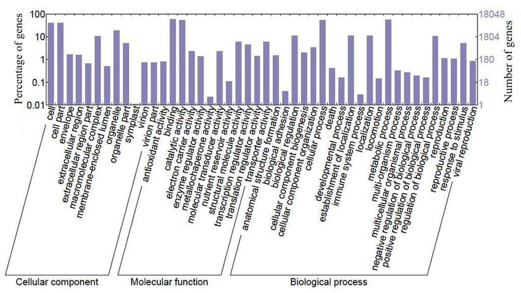 The annotation of unique putative transcripts was based on sequence homology using basic local alignment search tool (BLAST) 2.2.17 software. The unique sequences were searched against the UniProt database, the Nr database, the KEGG database, the COG database and the Nt database (E-value < 1 × 10−5). Annotations of unique sequences used for GO classification were acquired by BLASTX searching of the UniProt database. GO terms were assigned to all well-annotated sequences by performing Uniprot2GO program. The unique sequences were assigned to special biochemical pathways according to the KEGG standards using BLASTX. To reduce the redundancy, each sequence that had BLAST hit in the Nr database was given a unigene ID according to the best homologue they were aligned to; sequences aligned to the same homologue shared the same ID.