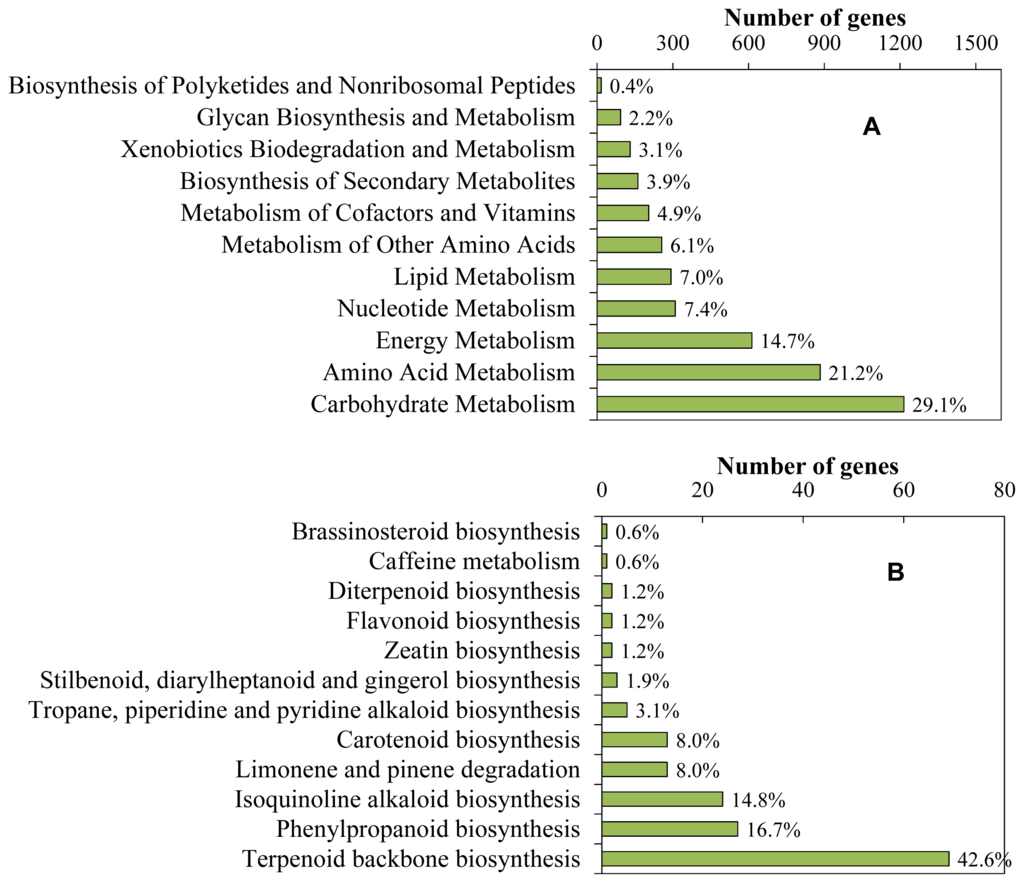 Pathway assignment based on Kyoto Encyclopedia of Genes and Genomes (KEGG). (A) Classification based on metabolism categories; (B) Classification based on secondary metabolism categories.