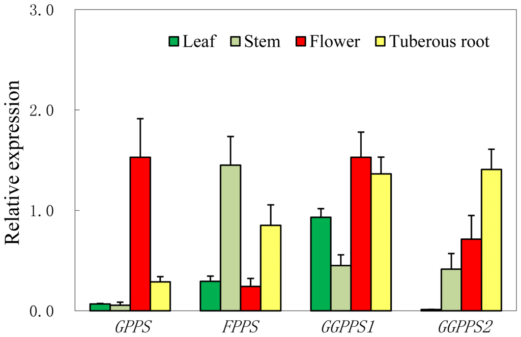 The expression pattern of four selected short-chain prenyltransferase genes in tissues of R. glutinosa. GPP: geranyl diphosphate synthase; FPPS: farnesyl diphosphate synthase; GGPPS: geranylgeranyl diphosphate synthase; Means ± SE; Three replicates of each qRT-PCR were performed.