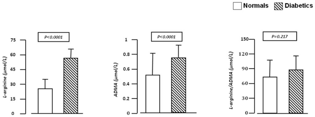We graphically reported the plasma concentrations mean values of ADMA and l-arginine in normal subjects and newly diagnosed type 2 diabetic patients. ADMA and l-arginine mean values were significantly (p < 0.0001) higher in diabetic patients than in normal subjects, but there were no significant differences in mean l-arginine/ADMA ratio between groups.