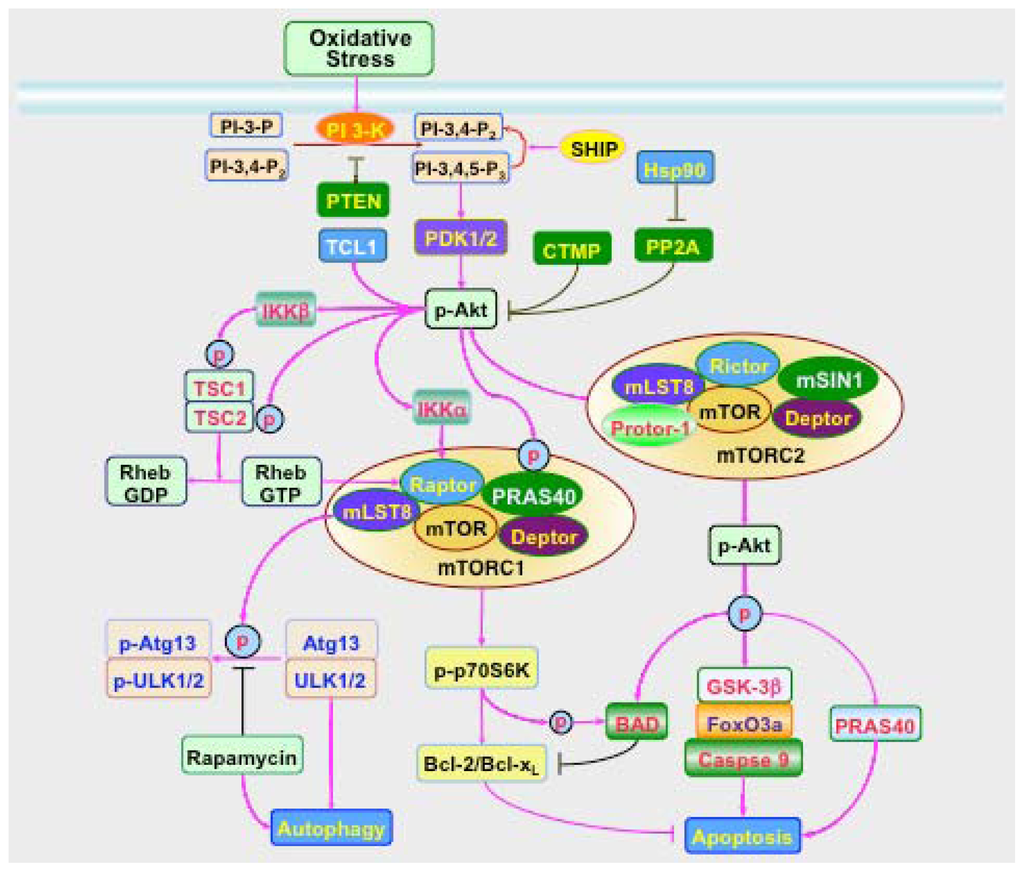 Signal transduction pathways of the PI 3-K, Akt, and mTOR cascade. During oxidative stress, multiple pathways are affected that involve PI 3-K, Akt, and mTOR that ultimately interface with programmed cell death pathways of apoptosis and autophagy. Activation of phosphoinositide 3 kinase (PI 3-K), such as by tropic factors that include erythropoietin can promote the production of phosphatidylinositide (3,4)-biphosphate (PI-3,4-P2) and phosphatidylinositide (3,4,5)-triphosphate (PI-3,4,5-P3) that recruits Akt to the plasma membrane. This recruitment activates phosphoinositide dependent kinase 1 (PDK1) and PDK2, leading to Akt phosphorylation. Akt activity can be blocked by the phosphatase and tensin homolog deleted from chromosome 10 (PTEN), SH2 domain-containing inositol phosphatase (SHIP), and carboxyl-terminal modulator protein (CTMP). Akt activity can be enhanced by the T cell leukemia/lymphoma 1 (TCL1) and 90 kDa heat shock protein (Hsp90) that can inhibit protein phosphatase 2A (PP2A). Akt can activate mTORC1 through phosphorylating TSC2 and disrupting the interaction between TSC2 and TSC1. Akt may also activate mTORC1 through I-kappaB kinase (IKK). IKKα associates with Raptor and IKKβ that can phosphorylate TSC1 and suppress TSC1 and its interaction with TSC2. In addition, Akt can directly phosphorylate proline rich Akt substrate 40 kDa (PRAS40) to reduce PRAS40 binding to regulatory associated protein of mTOR (Raptor) and thereby activate mTORC1. Upon activation, mTORC1 phosphorylates its downstream targets p70 ribosome S6 kinase (p70S6K) to phosphorylate pro-apoptotic protein BAD and increase the expression of Bcl-2/Bcl-xL which functions as an anti-apoptotic protein. mTORC1 activation also inhibits autophagic proteins autophagy related gene 13 (Atg13) and UNC-51 like kinase 1/2(ULK1/2) through phosphorylation to prevent autophagy. Rapamycin, an inhibitor of mTOR, can prevent this process and foster autophagy. mTOR signaling inhibits apoptosis though activation of Akt that inhibits “pro-apoptotic” proteins FoxO3a, glycogen synthase-3β (GSK-3β), BAD, and PRAS40.