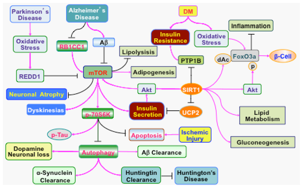Modulation of neurodegenerative disorders through PI 3-K, Akt, mTOR, and associated pathways of SIRT1. Oxidative stress leads to cell injury in multiple neurodegenerative disorders. In Parkinson’s disease (PD), oxidative stress can lead to the induction of the stress response protein REDD1 that can inhibit the activation of mTOR. The accumulation of amyloid (Aβ) during Alzheimer’s disease (AD) also can block the activation of mTOR. In AD, retinoblastoma tumor suppressor (RB1) inducible Coiled-Coil 1 (RB1CC1), which functions to activate mTOR, is reduced, contributing to neuronal atrophy in AD. The activation of the downstream target of mTOR, p70 ribosome S6 kinase (p70S6K), by phosphorylation (p) prevents acute neuronal injury during stroke. However, inhibition of mTOR and p70S6K is required to promote autophagy and the clearance of aggregate prone proteins, such as α-synuclein, Aβ, and Huntingtin to prevent neuronal loss. A fine balance of mTOR activation is necessary in these disorders since mTOR can lead to dyskinesia in PD and activation of p70S6K has been associated with the promotion of the phosphorylation of tau protein contributing to formation of neurofibrillary tangles. During diabetes mellitus (DM), increasing oxidative stress results in insulin resistance, which can be ameliorated by SIRT1. Activation of SIRT1 can increase the secretion of insulin by repressing the mitochondrial uncoupling protein 2 (UCP2), promoting lipolysis, and increasing gluconeogenesis. SIRT1 also can increase insulin sensitivity by inhibiting tyrosine phosphatase 1B (PTP1B). Elevated levels of oxidative stress can reduce insulin sensitivity and enhance the activity of FoxO3a. FoxO3a has multiple roles that can interact with SIRT1 and influence β cell function as well as modulate inflammation. SIRT1 can increase FoxO3a activity through deacetylation (dAc). SIRT1 also can activate Akt that decreases the activity of FoxO3a through phosphorylation (p). Enhanced activity of mTOR increases insulin secretion, induces adipogenesis, and inhibits lipolysis that can influence nervous system complications of DM.