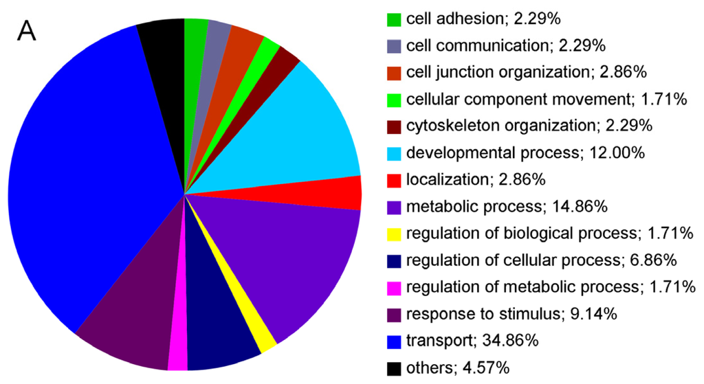 In contrast to alteration of proteins associated with cell adhesion and communication in passage-4 cells, Figure 1 demonstrates a noticeable decrease of proteins that are associated with transport as their biological process in passage-4 cells (6.74%) (Figure 1B, bright blue segment) compared to the native state (34.86%) (Figure 1A, bright blue segment), correlating with the observations in Table 1, where in passage-4 cells a strong decrease in ion transporting channels was noted.