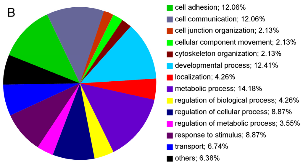 Classification of RPE cell surface proteins based on GO for biological process of native RPE cell proteins (A) and passage-4 RPE cell proteins (B). Numbers in percentages (%) correspond to the number of GO terms assigned for respective preparation. GO terms defined as others include those with an occurrence of <1.1%.