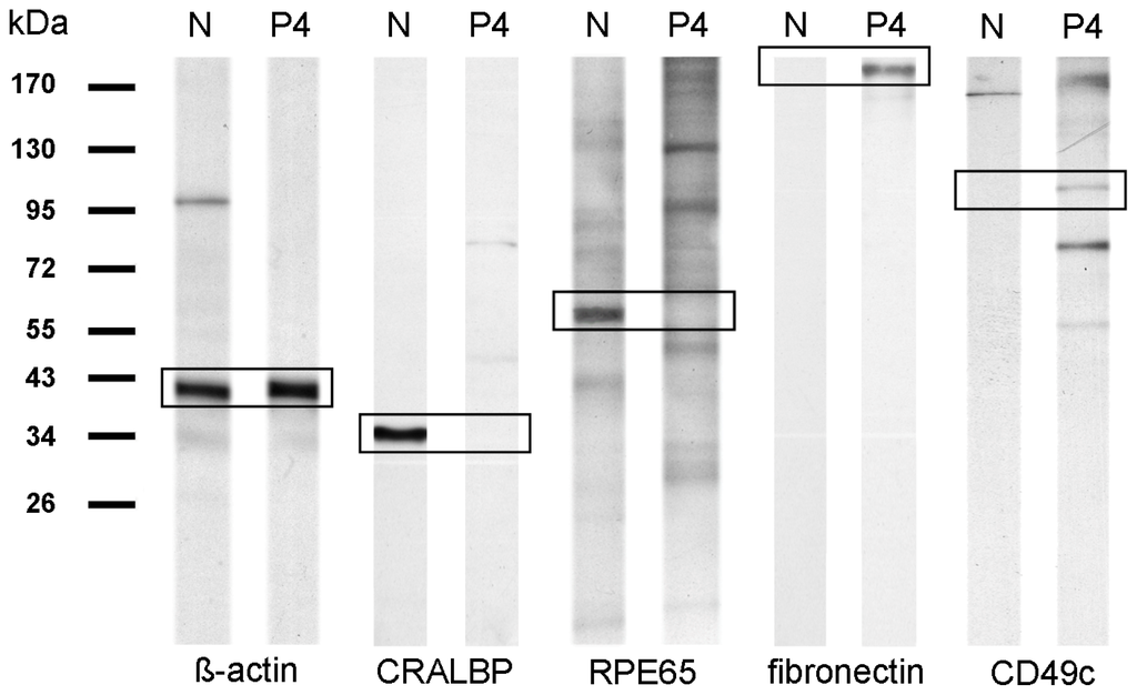 Western blot of a 10% 1D SDS-gel with lysates from native and cultured equine RPE passage-4 cells. N = native; P4 = passage-4. 5 μg protein of each lysate were loaded per lane. Boxes indicate the expected region for a signal regarding the molecular size of the respective protein.