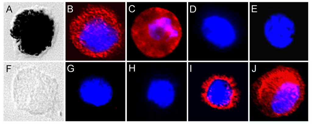 Immunocytochemistry of equine RPE cells. Upper panel (A–E) shows native equine RPE cells. Lower panel (F–J) shows cultured equine RPE cells of passage-4. Native cells show positive immunoreactivity for CRALBP (B) and RPE65 (C). Native cells show no immunoreactivity for fibronectin (D) and CD49c (E). In passage-4 RPE cells, CRALBP (G) and RPE65 (H) do not show immunoreactivity, other than fibronectin (I) and CD49c (J), which is found positive in passage-4 cells. Nuclei were stained with 4′6-diamidino-2-phenylindole (DAPI). A and F show Nomarski imaging of the respective RPE cells, native (A) and passage-4 (F).