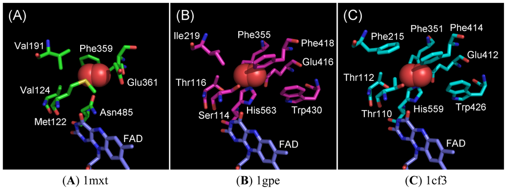 The currently available GOx crystal structures do not contain oxygen molecule; hence, we constructed oxygen-interacting structural models for GOxs based on the superimposition of ChOx (1MXT) with 2 representative GOxs—1gpe and 1cf3. The superimposition was carried out using UCSF Chimera Ver.1.3 [10] by fixing the position of FAD in their structures. Figures 1A shows an oxygen molecule in crystal structure of ChOx (PDB ID; 1mxt) [11] and Figure 1B,C show the oxygen molecule superimposed on 1gpe and 1cf3, respectively.