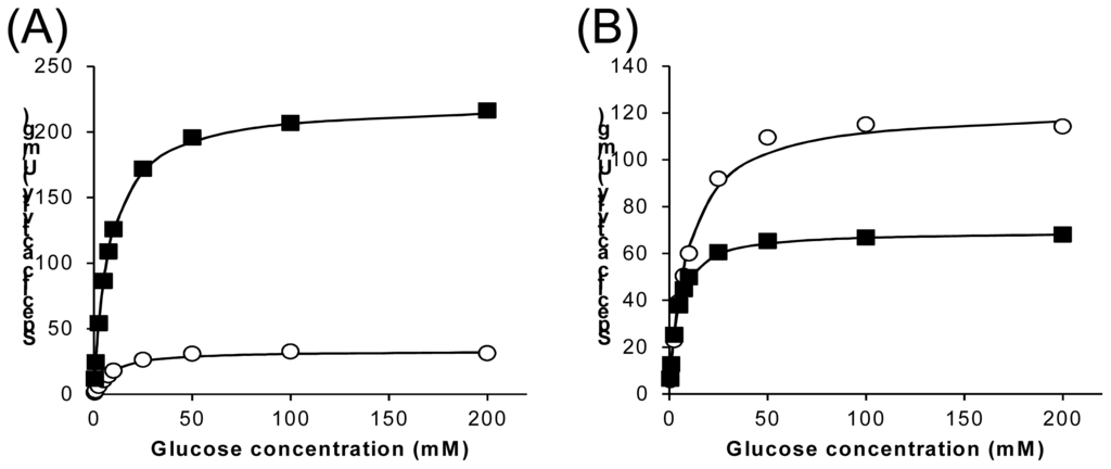 Oxidase and dehydrogenase activities of wild-type 1gpe and Ser114Ala mutant toward glucose (A) wild-type, (B) Ser114Ala mutant. Closed box: oxidase activity; open circle: dehydrogenase activity.