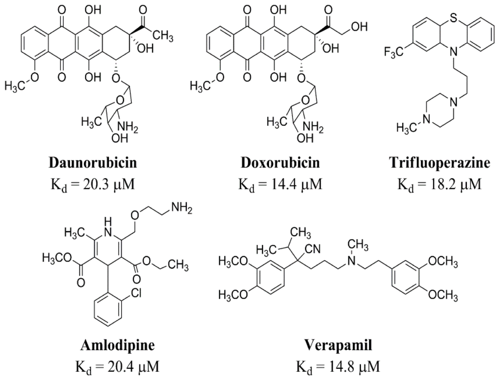 The 2-D line drawings of the strong binders for human cardiac muscles (hCASQ2) and their corresponding experimental dissociation constants (Kd). Chemical structures for the complete set of the tested strong, intermediate, and poor binders are included in the Supplemental file 1.