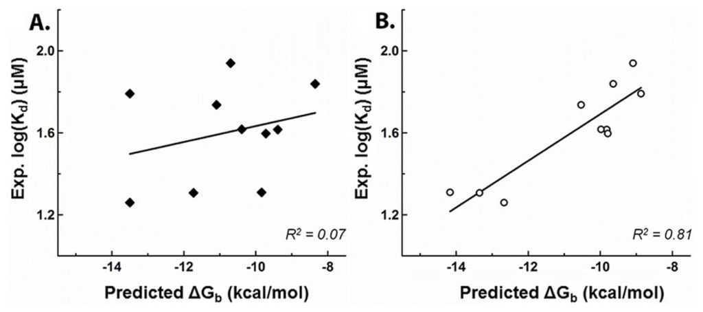 The 2-D correlation plots of the molecular docking scores (ΔGb) versus the logarithm of experimental dissociation constants, Experimental log(Kd) through least-square fitting using the crystal structures of hCASQ2 (2VAF-left, A) and cCASQ2 (1SJI-right, B) as receptor models.