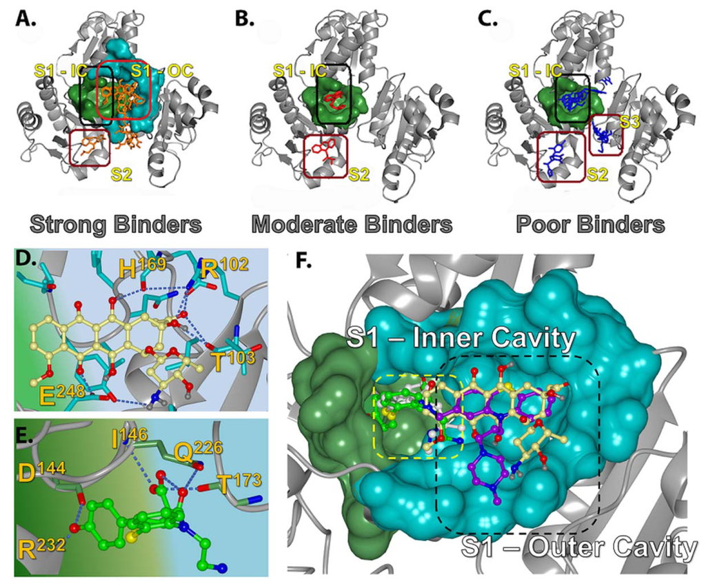 Binding-pockets predicted for the drug molecules. The different cavities and sub-cavities are highlighted by boxes with different colors and are individually labeled. (A) Strong binders; (B) Moderate binders; (C) Poor binders; (D) The predicted binding mode of doxorubicin (DOX) reveals its occupation at the larger S1-OC, being strengthened by several H-bonds with the neighboring amino acids; (E) The predicted binding mode of diltiazem (DTZ) reveals a unique orientation in which it occupies both the S1-IC (phenyl ring) and the S1-OC; (F) Two boxes with dashed lines indicate different regions within the S1 site. S1-IC is indicated by the yellow line and S1-OC is indicated the black line. These figures were generated using Open-Source PyMOL™ (v1.4).