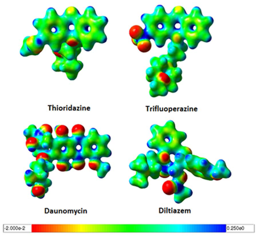 Gas phase geometry optimizations using the B3LYP hybrid functional [32–34] and 6-31 + g(d) basis sets were performed in Gaussian 03 [35] in order to calculate the surface charge distribution for daunomycin (DAN), desipramine (DSP), diltiazem (DTZ), propafenone (PFN), thioridazine (TDZ), and trifluoperazine (TFP). The resultant electrostatic potentials were mapped on their van der Waals surfaces (Figure 1) using GaussView 3 [36]. The surface charge distribution of drugs with similarly-charged surfaces were cross-compared to determine if they bound in a likewise manner in docking experiments.