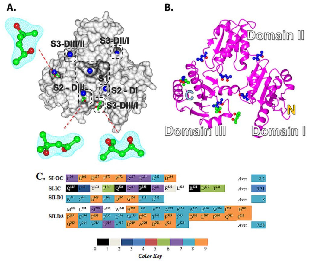 Amino acid sequence conservation profile of rCASQ1 was studied using the ConSurf [25–27] algorithm as employed in the web server. The target sequence (rCASQ1) was used for multiple alignments with other homologous CASQs that were retrieved separately using the BLAST [24] algorithm. The conservation profiles of amino acids at each position were later quantified in the score range of 1 (no conservation) to 9 (fully conserved) by ConSurf. This analysis revealed that at least 60%–70% of the whole CASQ sequence is conserved among a wide range of species, while >90% of the pockets that were predicted to host the known sets of strong, moderate and poor binding drugs (i.e., S1 and S2) are highly conserved (Figure 5C). Since these two sites represent the junctions between the three domains of CASQ and can significantly affect the polymerization of CASQ. The overall conservation of amino acid sequences and both the SI-OC and SII pockets indicate that they are significant to the function of the protein and hence its normal function will be disturbed upon drug-association.