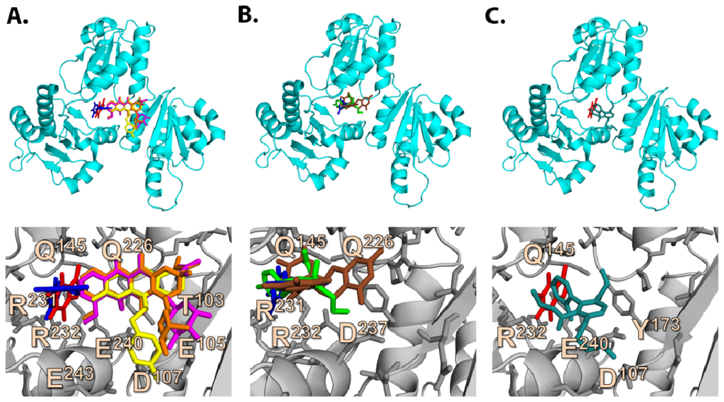 The structural insights for competitive inhibition. (A) Overlap of the binding modes for caffeine (red)/gallocatechin (blue) and strong binders; daunorubicin (magenta), doxorubicin (brown), and trifluoperazine (yellow); (B) Overlap of the binding modes for diltiazem (green), epigallocatechin (blue), and epigallocatechin gallate; (C) Overlap of the binding modes for amlodipine (teal) and caffeine (red). These figures were generated using Open-Source PyMOL (v1.4).