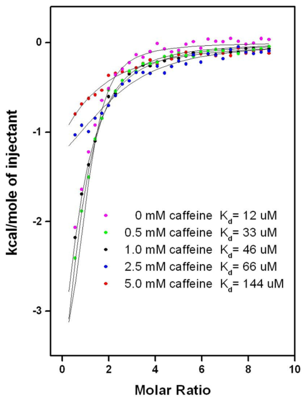 ITC experiments were conducted using a previous protocol [9], with slight modifications. The protein and drug concentrations were kept at 50 μM and 2 mM, respectively, while the CAF concentration was allowed to vary between 0 and 5 mM for different drugs. Compounds with poor aqueous solubility were dissolved first in DMSO and then diluted into ITC buffer with final concentrations of DMSO not exceeding 2%. Origin software (Origin Lab Corp, Northampton, MA, USA) was used to fit the data to a one-site binding model via non-linear least squares regression.
