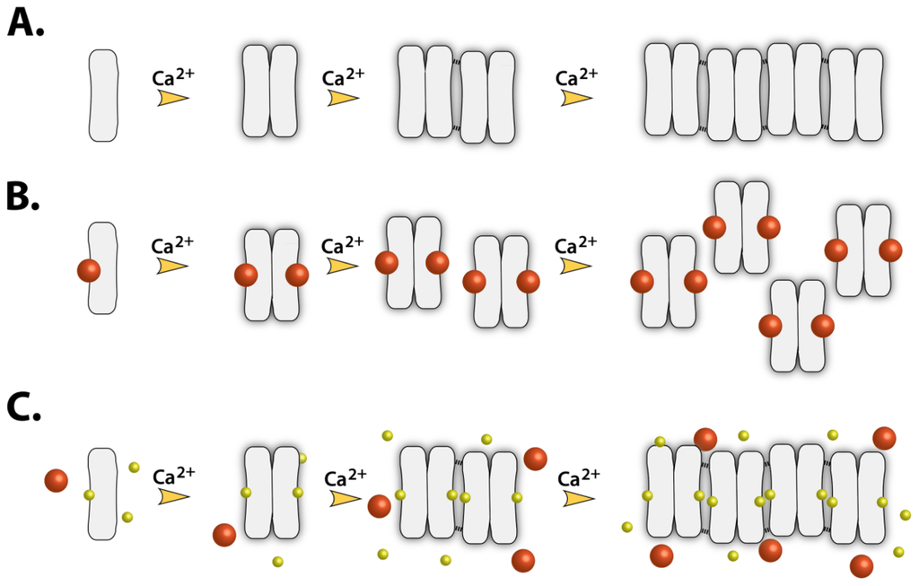 Schematic diagram of the polymerization of CASQ2. (A) The mechanism of Ca2+-sequestration via polymerization of the CASQ monomers; (B) The hypothetical inhibition mechanism of drug preventing polymerization of CASQ. The drugs are represented as big orange spheres; (C) In the presence of high concentrations of weak binders such as CAF and EGC (small yellow spheres), occupation by strong binders is being inhibited, while the weakly binding small molecules do not significantly affect CASQ2 polymerization.