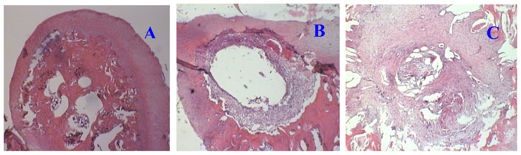 For histological evaluation, the whole defect region, including surrounding cartilage and some hard bone tissue, was dissected and fixed in 10% buffered formalin for 1 week. Specimens were decalcified in 0.5% EDTA solution containing 0.1 M amino-n-caproic acid (Sigma Chemical Co., St. Louis, MO, USA) and 0.005 M benzamidine and embedded in paraffin. Four-micrometer sagittal sections of the defect area were collected and stained with hematoxylin and eosin (H and E) according to standard protocol.