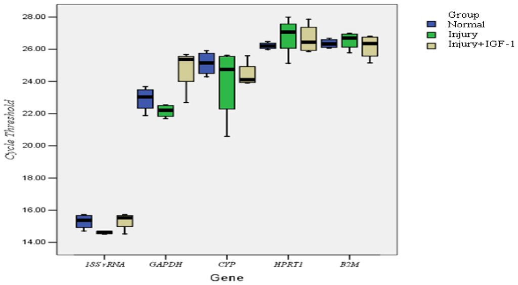 qPCR cycle threshold values for five candidate reference genes among three groups. Candidate reference genes include 18S rRNA, GAPDH, CYP, HPRT1, and B2M. Three groups were evaluated: normal (group A), injury (group B), injury + IGF-1 (group C). Boxes represent lower and upper quartiles of cycle thresholds range with medians. The distributions of Ct values was wide, from a high of 28.86 (HPRT1) to a low of 14.52 (18S rRNA).