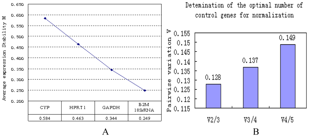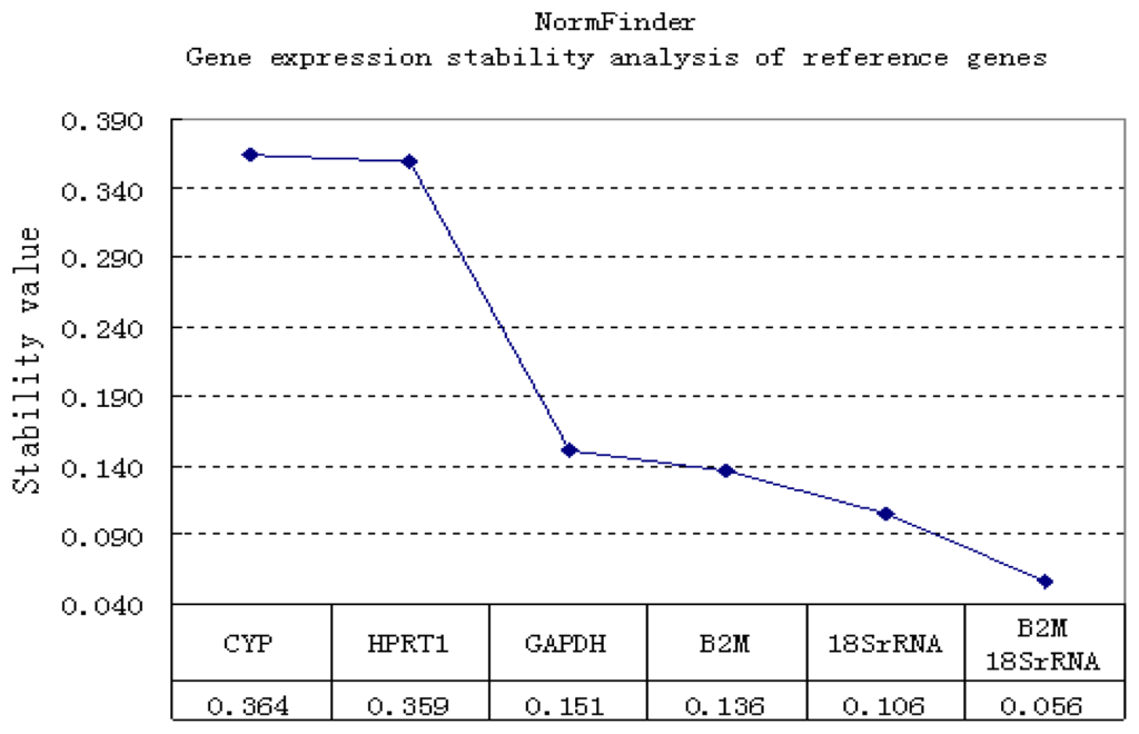 The candidate reference genes were also analyzed by another program, NormFinder (Figure 4). In this analysis, higher expression stability is indicated by a lower stability value, which is as an estimate of the combined intra- and intergroup variation of the individual gene [24]. The NormFinder analysis also indicated that B2M and 18S rRNA were the most stably expressed genes. 18S rRNA, the least affected reference, has a stability value of 0.106. In addition, the geometric average indicated that the combination of B2M and 18S rRNA reduced the stability value to as low as 0.056.