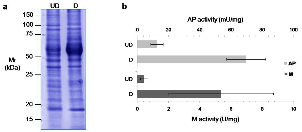 (a) Monodimensional protein pattern detected by Coomassie staining of the secretome of undifferentiated (UD, left) and differentiated (D, right) Caco-2 cells; Mr: relative molecular mass; (b) Specific activity of the enzymes alkaline phosphatase (AP, clear bars) and maltase (M, dark bars), known markers of enterocytic differentiation.