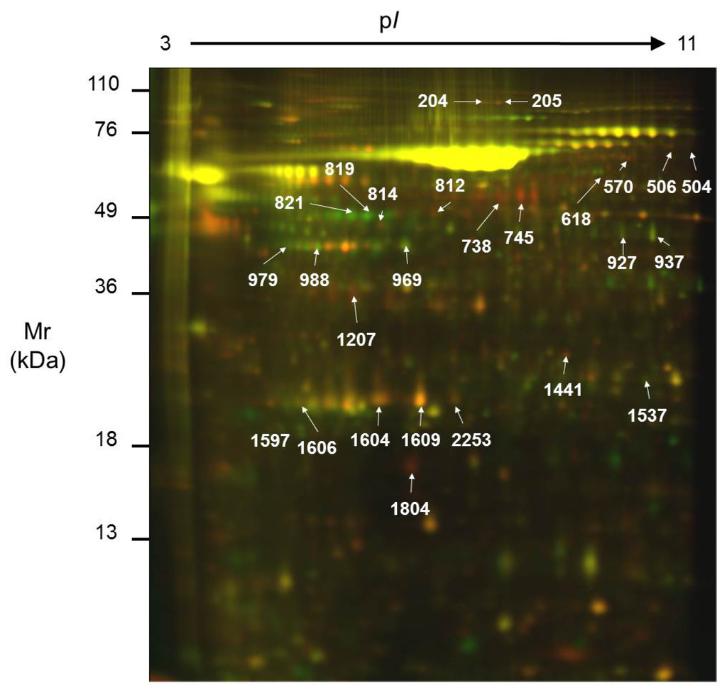 Representative Differential In-Gel Electrophoresis (DIGE) analytical gel where the secretome of an undifferentiated Caco-2 culture has been labeled with Cy5 (red spots) and the secretome from a differentiated culture with Cy3 (green spots). Yellow areas represent overlapping spots. The spots identified are labeled with the spot number. Mr: relative molecular mass; pI: isoelectric point.