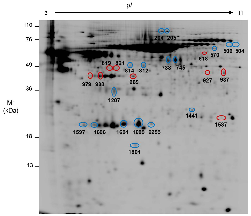 Representative 2-D map where the spots with significant variation due to Caco-2 differentiation identified by MS are highlighted. The spot numbers correspond to those shown in Table 2. Blue circles indicate higher expression and red circles lower expression in undifferentiated (tumor-like) cells. Mr: relative molecular mass; pI: isoelectric point.