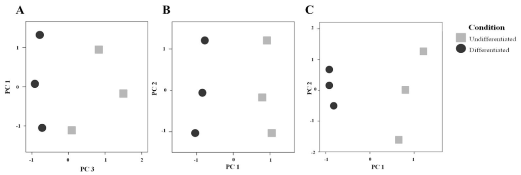 (a) Plot of the most relevant principal components (PCs) found when analyzing the abundance of all the protein spots detected by DIGE in the secretome of undifferentiated and differentiated Caco-2 cells. These cell states can be differentiated by PC3 (X axis), reflecting a characteristic protein pattern before and after differentiation. The Y axis (PC1; same results found for PC2) groups the samples on the basis of the gel were they ran, indicating a technical contribution; (b) Separation given by principal component analysis (PCA) only on the spots that were significantly different between the cell states; (c) Separation of cell states given by PCA only on the 22 identified spots.