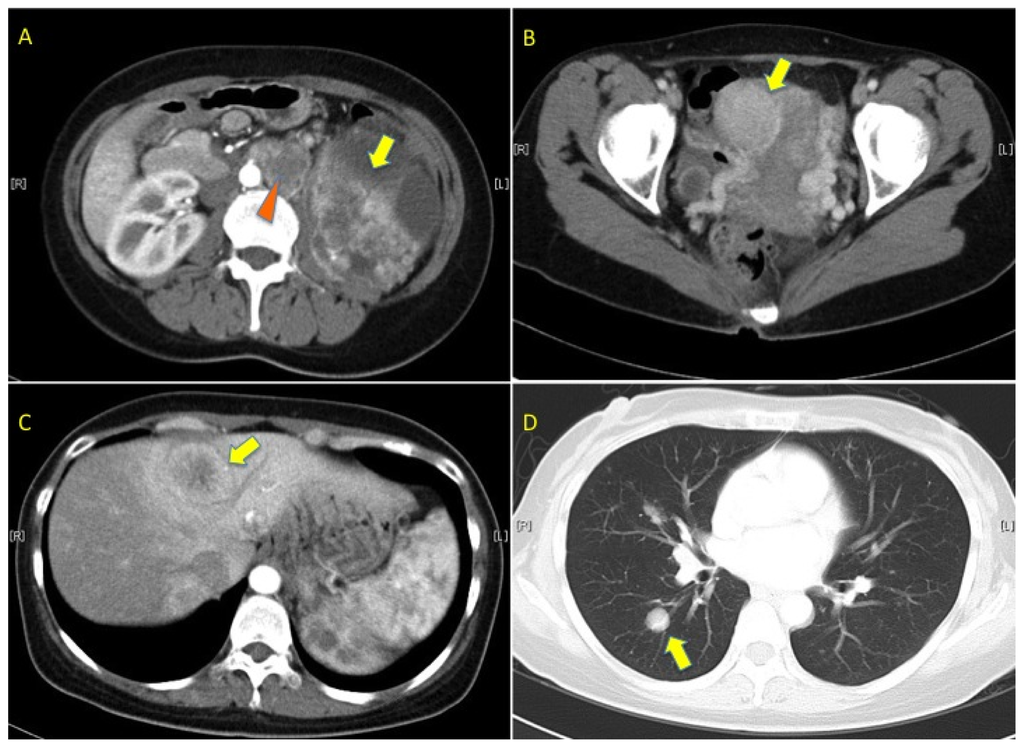 Computed tomography (CT) imagings of the proband of pedigree 1. (A) Enhanced CT scan of the patient’s abdomen showing a large enhanced and some necrotic left renal tumors (arrow). There are also multiple enlarged para-aortic lymph nodes (arrowhead); (B) Enhanced pelvic CT demonstrates multiple large uterine leiomyomas (arrow); (C) Enhanced abdominal CT shows multiple liver lesions (arrow); (D) Chest CT scan shows multiple lung lesions (arrow). The liver lesion shown by the arrow in C and the lung lesion shown by the arrow in (D) are examples of multiple lesions.