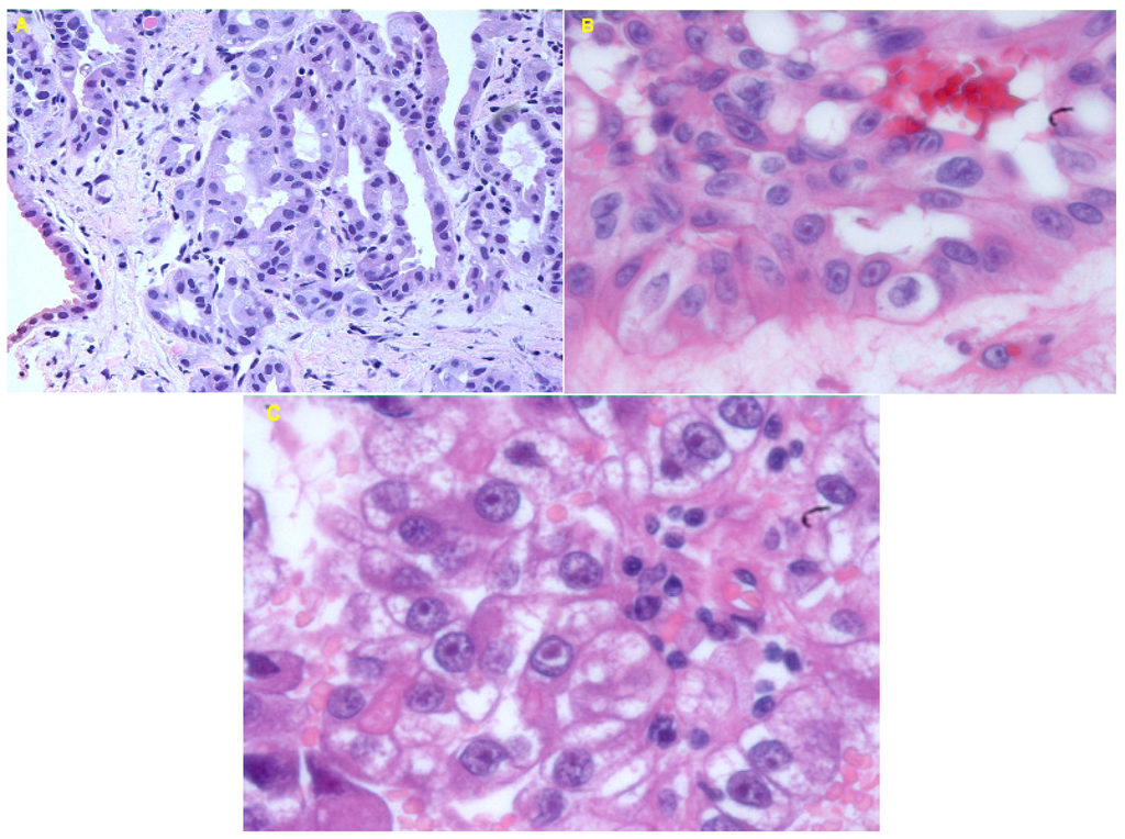 Microscopic features of three examples of hereditary leiomyomatosis and renal cell cancer (HLRCC). (A) Proband (III-9) from pedigree 1. Fine needle aspiration of the renal tumor revealed a tubulo-papillary architecture with prominent nucleoli (hematoxylin and eosin, 20×); (B) III-4 from pedigree 1. The renal cancer cells show prominent eosinophilic nucleoli, some surrounded by a clear halo (hematoxylin and eosin, 100×); (C) The female from pedigree 2. The renal tumor consists of cells with eosinophilic cytoplasm and large nucleoli surrounded by clear halo-like spaces (hematoxylin and eosin, 100×).