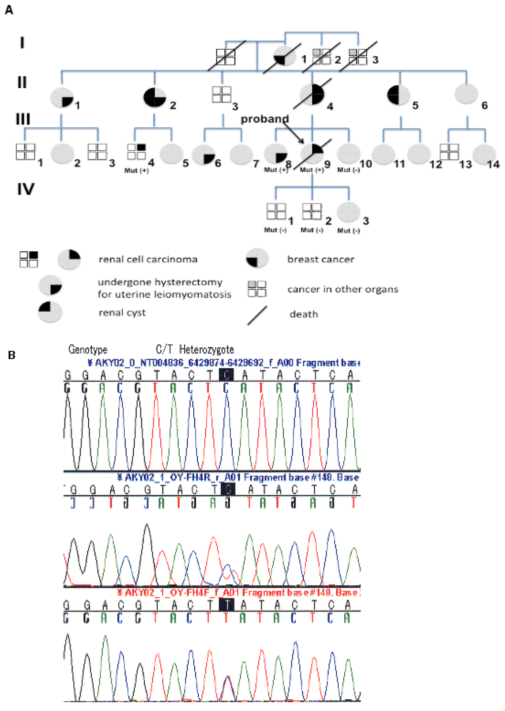 Pedigree and mutation analysis. (A) Pedigree of family 1. Generations are represented by Roman numerals and individuals are shown by Arabic numerals. The index patient (proband) is III-9, and is indicated by the arrow. “Mut” shows mutation screening. “Mut +” and “Mut −” indicate mutation-positive and mutation-negative individuals, respectively; (B) FH mutations in the patients. Sequencing chromatograms of genomic DNA from a control subject and patients III-4, -8, and -9. Sequence analysis revealed a germline C to T mutation at cDNA position 574 (C574T) that changes histidine to tyrosine at codon 192 (H192Y), suggesting loss of the wild-type FH allele.