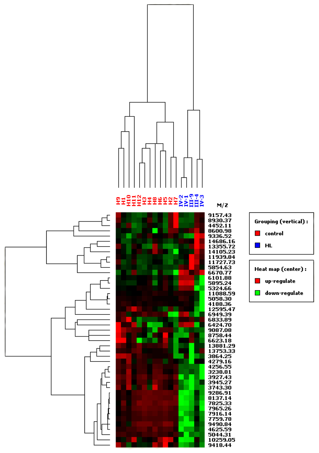 Protein peaks were selected by employing a first pass signal-to noise ratio of 5, followed by a second pass signal-to-noise ratio of 2 and peak selection at 0.3% of the mass window. After preliminary analysis of protein spectra, the selected protein peaks were subjected to HCA analysis. To create a heat map, the 45 significant peaks identified by individual analysis were all used. On the resulting heat map (Figure 4), patients who had familial renal carcinoma were discriminated from controls. Principle component analysis (PCA) was performed to assess the differences of proteins between the two groups, revealing separation between the HLRCC group and the control group (Figure 5).