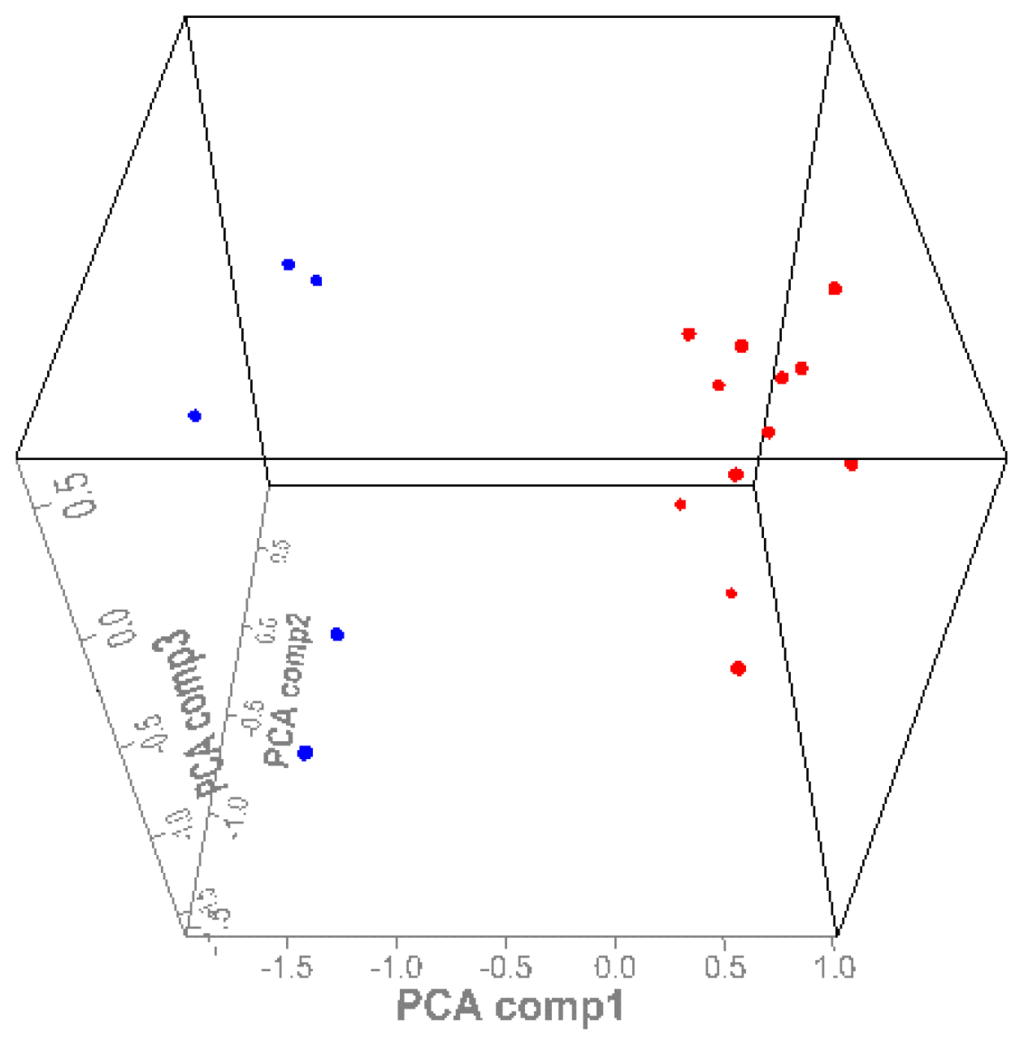 Three-dimensional principal component analysis (PCA) of protein profiling. Cluster A (blue: HLRCC), cluster B (red: healthy volunteers). Samples from the two groups are highly concentrated in certain areas.