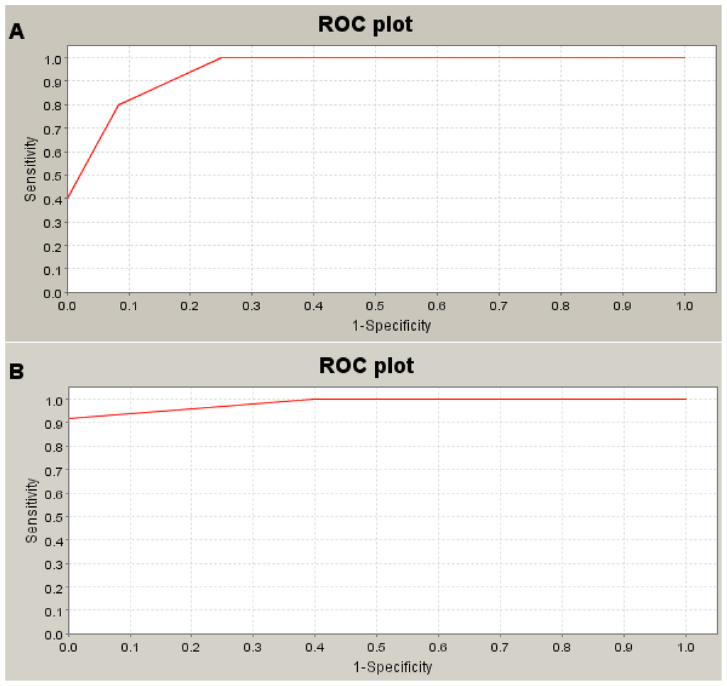 Representative receiver operating characteristic curves (ROC) for the detection of HLRCC. (A) When the curve was plotted for the enlarged peak at 5855 m/z (A), the area under the curve (AUC) was 0.95. (B) For the reduced peak at 3239 m/z, AUC was 0.98.