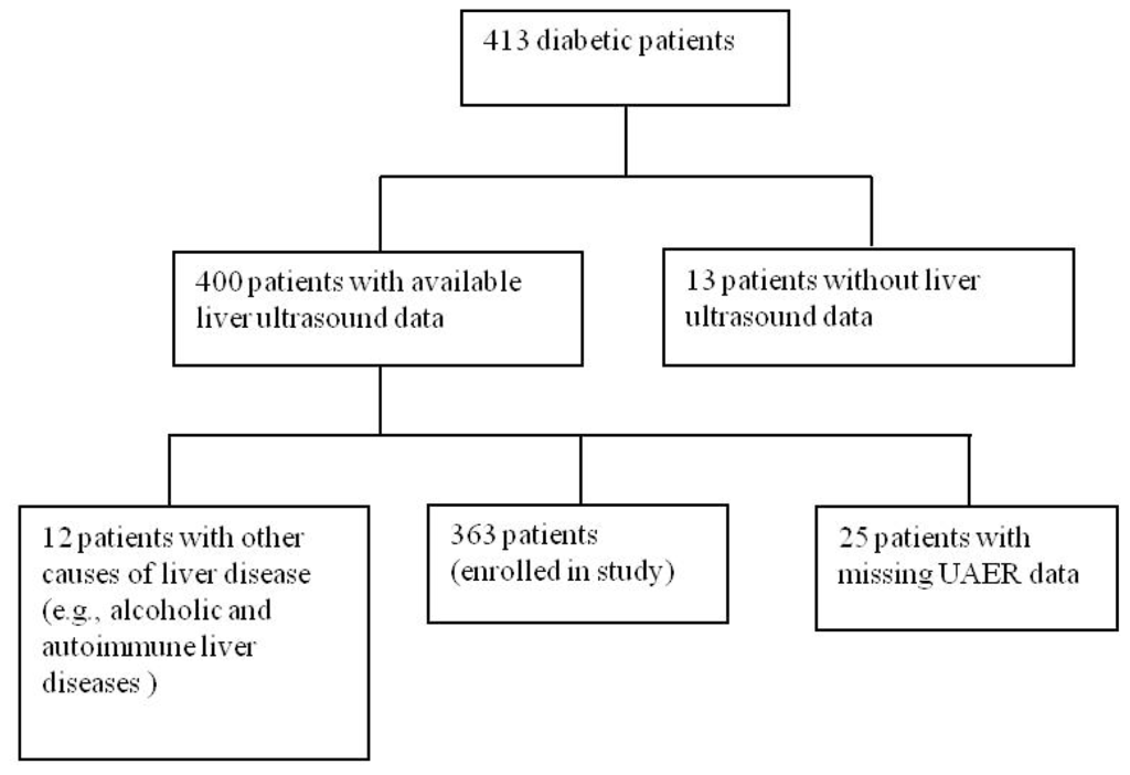 As shown in Figure 1, 413 type 2 diabetic patients were initially screened. Among them, excluded patients consisted of 13 subjects who did not have a liver ultrasound examination, 11 subjects (male) who consumed more than 20 g of alcohol per day, 1 subject who had autoimmune liver disease, and 25 subjects who did not have a UAER test. As a result, the remaining 363 patients met the inclusion criteria for further diagnosis of NAFLD, i.e., hepatic steatosis without excessive alcohol consumption or other causes of chronic liver disease.