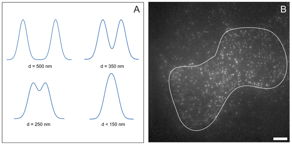 (A) Simulated intensity cross sections through a pair of single molecule fluorescence emitters with varying separations. Individual features can only be resolved when the molecules are separated by a distance greater than the point spread function of the microscope; (B) Single molecule TIRF image of EGFR in the plasma membrane of HeLa cells (expressing approximately 50,000 EGFR molecules per cell). EGFR are labelled with their ligand EGF, conjugated with the fluorophore Atto 647N (bar 8 μm). The white line shows the approximate cell borders.
