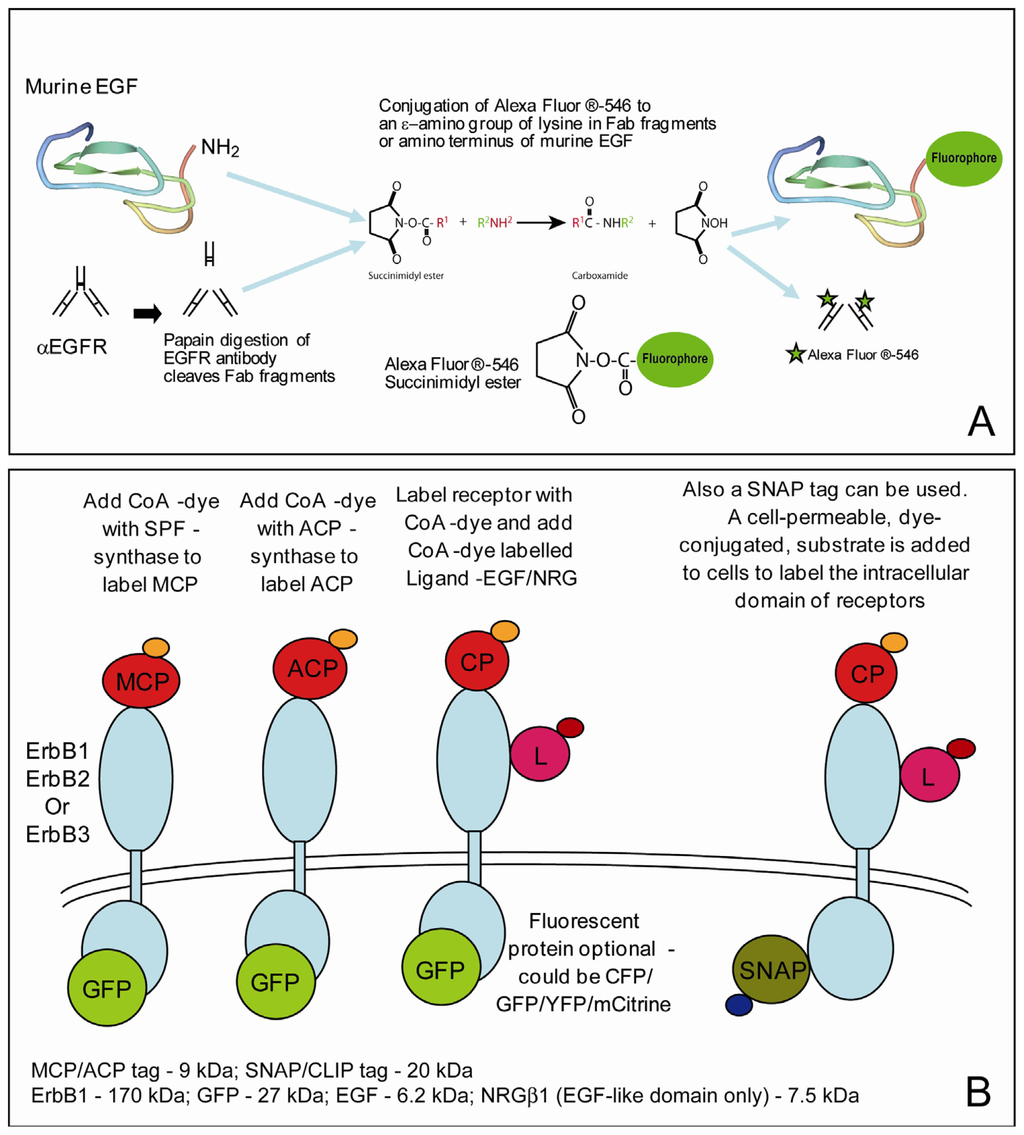 Ligands can be chemically labeled using, for example, succinimidyl ester derivatives of fluorescent dyes that provide an efficient and convenient way to covalently cross-link the fluorophore specifically to primary amines (R–NH2) in the ligand, found in lysine residues and at the N-terminus. Similarly, maleimide derivatives can be used to label thiol groups (R–S–H), present in cysteine residues (Figure 2A). The desired 1:1 dye/ligand stoichiometry is easy to achieve if ligands do not have any lysine residues, such as, for example, the epidermal growth factor (EGF) ligand which binds the extracellular domain of HER1, because the dye can only bind the N-terminus. Similarly, 1:1 stoichiometry can be easily obtained with ligands that have a single cysteine residue, such as, for example, affibody ligands. If two cysteines are present, it is often possible to mutate one to another small amino acid whilst maintaining good affinity for the receptor.