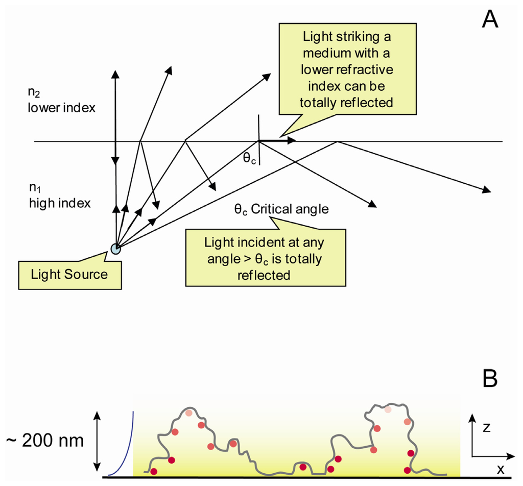 (A) Illustration of the principle of Total Internal Reflection Fluorescence (TIRF) microscopy. (B) Effect of TIRF illumination on fluorescent molecules in the plasma membrane of adherent cells; molecules close to the cover slip receive more intense illumination, and there is no illumination beyond a depth of approximately 200 nm.