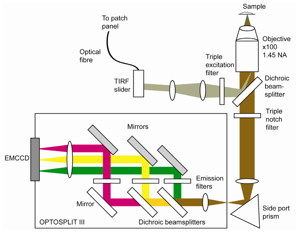 Schematic view of a microscope set up for 3-colour single molecule TIRF microscopy.