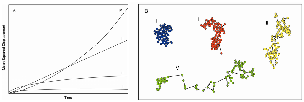 (A) Simulated mean squared displacement plots for particle tracking. I shows diffusion for confined molecules, II shows obstructed diffusion, III normal diffusion, and IV shows MSD for directed motion; (B) shows example particle tracks for the motion types plotted in (A) [115].