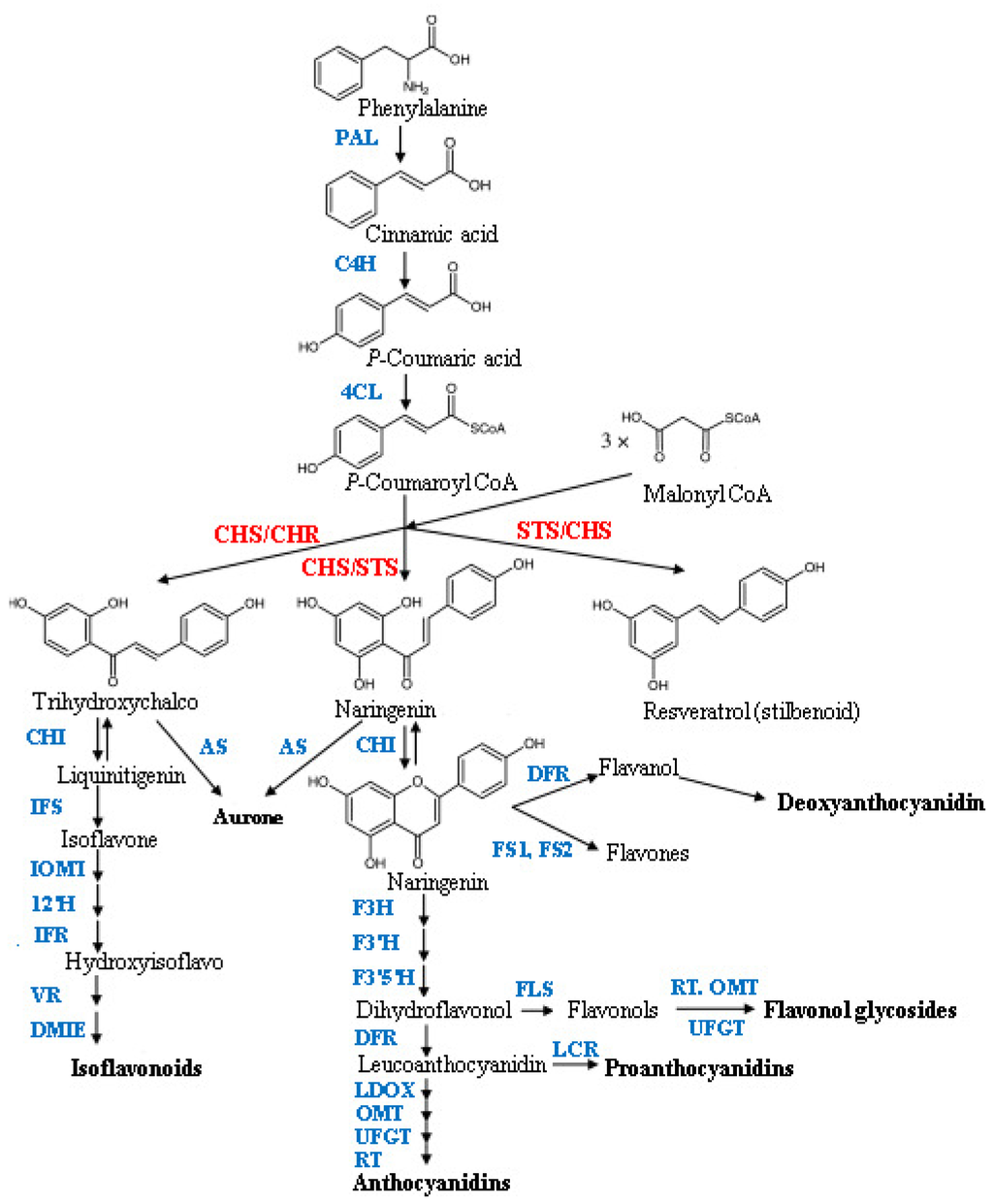 Flavonoid biosynthetic pathway. ANS, anthocyanidin synthase; AS, aureusidin synthase; C4H, cinnamate-4-hydroxylase; CHR, chalcone reductase; DFR, dihydroflavonol 4-reductase; DMID, 7,2′-dihydroxy,4′-methoxyisoflavanol dehydratase; F3H, flavanone 3-hydroxylase; F3′H, flavonoid 3′ hydroxylase; F3′5′H, flavonoid 3′5′ hydroxylase; FS1/FS2, flavone synthase; I2′H, isoflavone 2′-hydroxylase; IFR, isoflavone reductase; IFS, isoflavone synthase; IOMT, isoflavone O-methyltransferase; LCR, leucoanthocyanidin reductase; LDOX, leucoanthocyanidin dioxygenase OMTO-methyltransferase; PAL, phenylalanine ammonia-lyase; RT, rhamnosyl transferase; UFGT, UDP flavonoid glucosyl transferase; VR, vestitone reductase; STS, stilbene synthase; FLS, flavanol synthase [16].