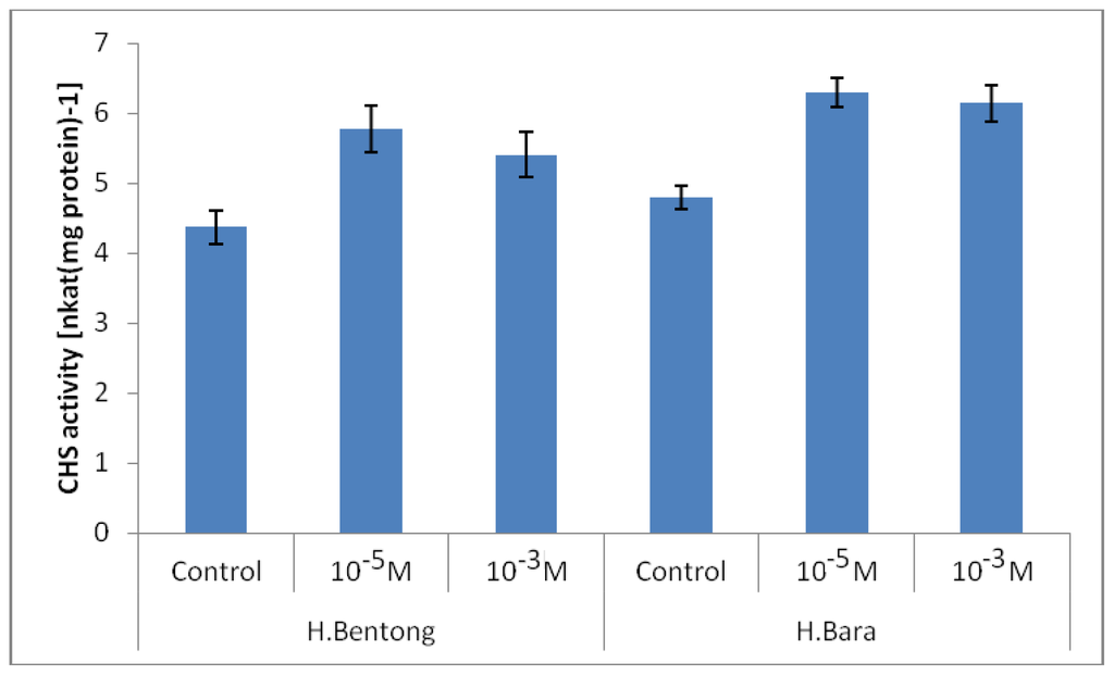 According to the results CHS activity was influenced by SA concentration (p ≤ 0.01; Figure 2). In both varieties treated with SA, CHS activity was found to be consistently higher in ginger treated with 10−5 M SA with values ranging between 5.77 and 6.30 nkat mg protein−1 than in gingers treated with 10−3 M SA, which recorded CHS activity of 5.40 to 6.14 nkat mg protein−1. Plants not treated with SA showed the lowest values for CHS activity which were registered between 4.37 and 4.80 nkat mg protein−1. The present study showed that with SA application the activity of CHS was enhanced. This is basically due to the fact that CHS is a precursor to flavonoids biosynthesis [22,23]. The increase in CHS activity is usually followed by an increase in C/N ratio due to the enhanced growth rate using SA. Results of recent studies suggest that increases in the C/N ratio in plants are an indication of increases in the synthesis of secondary plant metabolites, especially flavonoids [24,25].