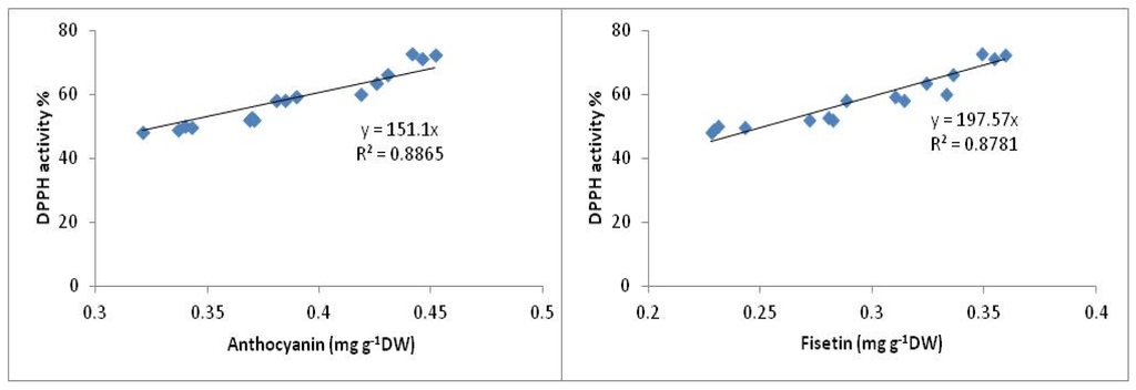 Relationship between anthocyanin and fisetin with DPPH activity in ginger varieties.