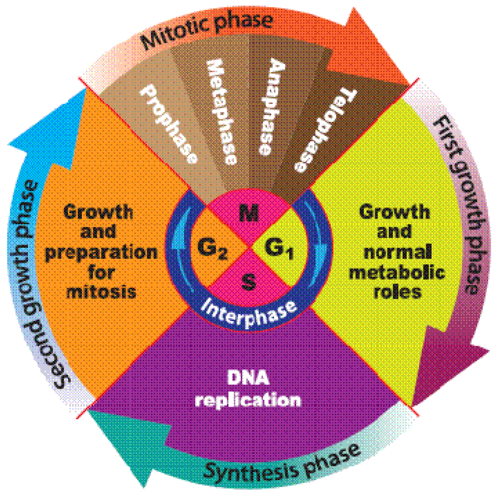 The cell cycle constitutes a series of molecular events of cell division during which cells grow and divide to give rise to new daughter cells. It is generally divided in to four phases, namely G1 (gap 1 phase), S (synthesis phase), G2 (gap 2 phase), and M (mitosis phase). G1 and G2 are two breaks with variable duration separating the S and M phases as depicted in Figures 1 and 2; this gives the cycle its general illustration of G1-S-G2-M [19,20]. Disruption of execution of normal cell cycle plays a vital role in the development of cancer [21,22]. The cell cycle is regulated by two vital classes of molecules: The cyclin (cyclin A–cyclin T) and the cyclin-dependent protein kinases (CDK 1–CDK 9). CDK/cyclin complexes are in turn excited by CDK-activating kinase (CAK) also known as cdk7/cyclin H. Growth of cell is necessary before S phase of the cell cycle begins and c-myc in addition to its role in both cell cycle and cell proliferation, is believed to play a key role in this important event of increase in cell volume [19,23,24]. Go phase is a resting phase during which cells stop undergoing cell cycle including replication. These nonreplicating cells are either quiescent or senescent cells. It is now believed that anticancer agents that target cell cycle may significantly determine the success of cancer chemotherapy, as well as provide clues in finding a complete cure for many tumors, hence, targeting the different stages of cell cycle could play a vital role in the discovery of new anticancer drugs [18,19,21].