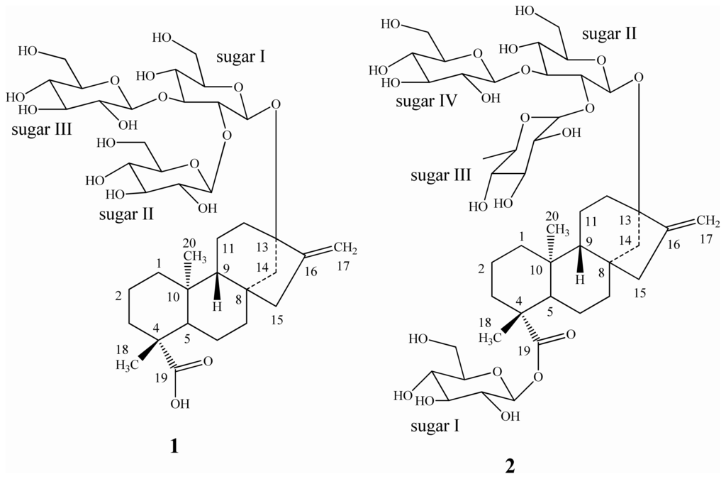 - Chaturvedula, V.S.P.; Prakash, I. Structures of the novel diterpene glycosides from Stevia rebaudiana. Carbohydr. Res 2011, 346, 1057–1060. [Google Scholar]