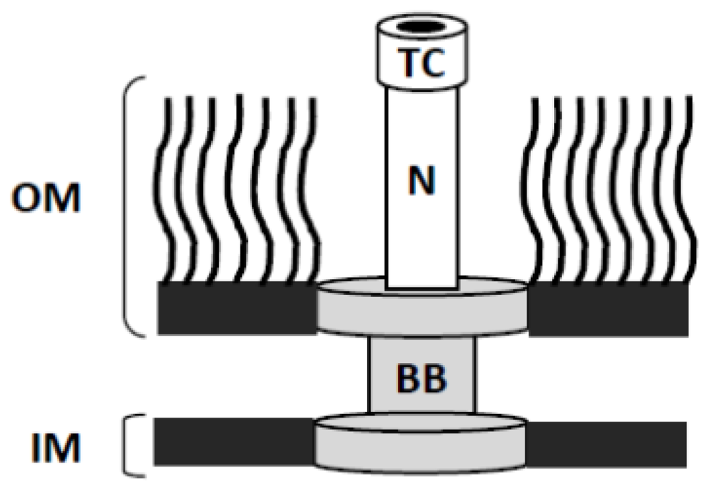 - Erhardt, M.; Namba, K.; Hughes, K.T. Bacterial nanomachines: The flagellum and type III injectisome. Cold Spring Harb. Perspect. Biol 2010, 2, a000299. [Google Scholar]