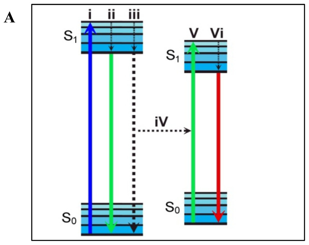 Panel A shows the coupled transitions that occur between an excited state FRET donor and ground state FRET acceptor within the context of a Jablonski diagram. Absorption of radiation of the correct energy promotes the excitation of the donor fluorophore to an electronic excited state (i) which quickly decays through vibrational relaxation as illustrated with the short dashed arrows. The excited state fluorophore can now return to ground state through several pathways including emission of a photon (ii). If an appropriate FRET acceptor is located near the excited state donor, it can undergo a non-radiative relaxation event (iii) in which the associated energy of the system is non-radiatively transferred to the ground state acceptor (iv) resulting in its elevation to an appropriate electronic state (v). The excited state acceptor can then eventually return to ground state through the same options as for the donor, including emission of a photon (vi). For clarity, several energy transitions not directly pertaining to FRET, such as rotational energy levels and intersystem crossing were excluded from the diagram. Panel B shows the excitation/emission spectra for a hypothetical FRET pair. The efficiency of energy transfer events outlined in panel A are dependent on several factors with potentially the most easily controlled (through choice of fluorophores) being J(ë) or the spectral overlap integral of the donor emission (solid blue) and acceptor excitation (dashed green).
